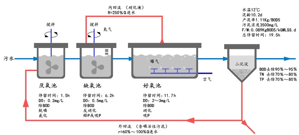 A2/O工藝作為活性污泥工藝的升級(jí)工藝,在去除有機(jī)污染物的同時(shí)具有生物脫氮除磷的作用。